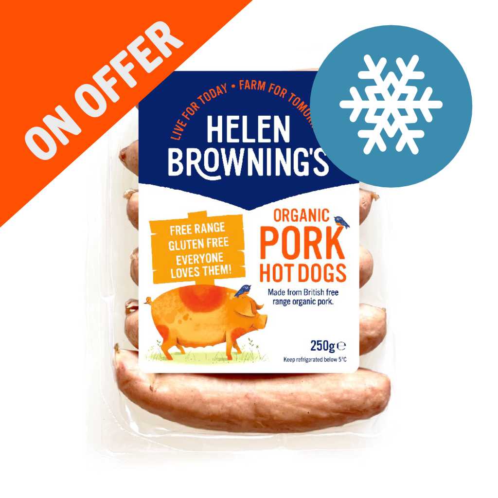 The hot dog reinvented. 96% free-range UK organic pork; no fillers, only delicious prime cuts used. Moist and meaty, with texture, flavour, bite and character, slightly smokey and completely different from any other hot dog on the market. Quick cook, gluten-free, non-GM with a slightly smokey ‘straight-from-the-BBQ’ hit. Loved by young and old. 250g. Dispatched frozen.