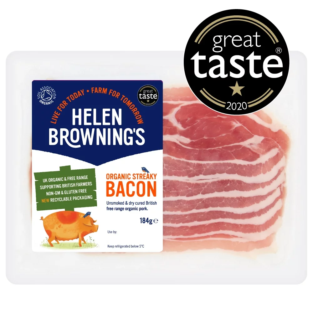 Why is our bacon better? We all love bacon. Whether folded in a soft roll for breakfast or as a versatile ingredient in so many suppers. But bacon has traditionally been cured with added nitrates and nitrite salts to keep it safe, which have been the subject of health concerns in recent years. Helen Browning has been keen to recreate our award-winning bacon without using these additives, while retaining organic integrity – and even improving the natural rich, robust pork flavour of our streaky and back rashers.